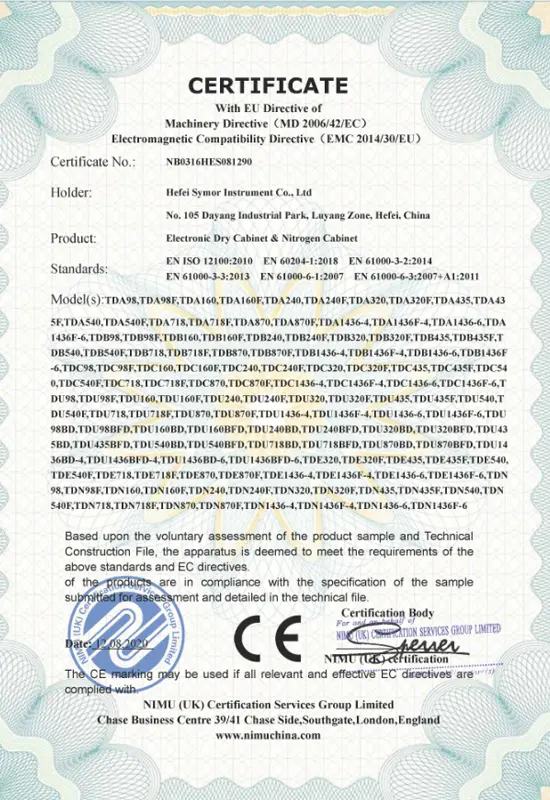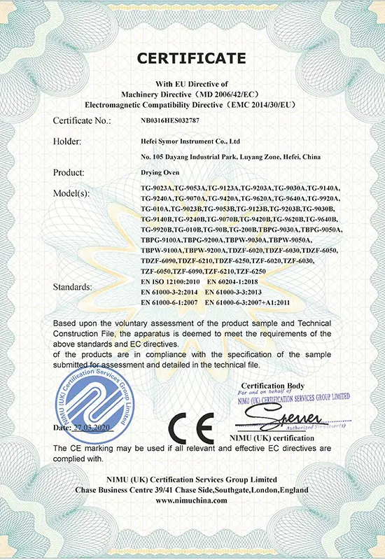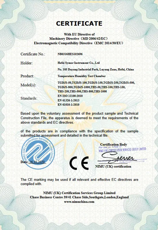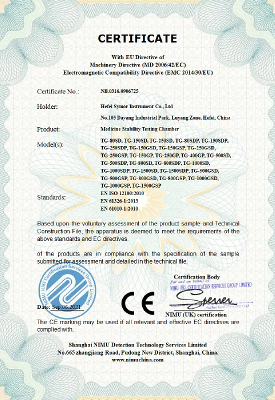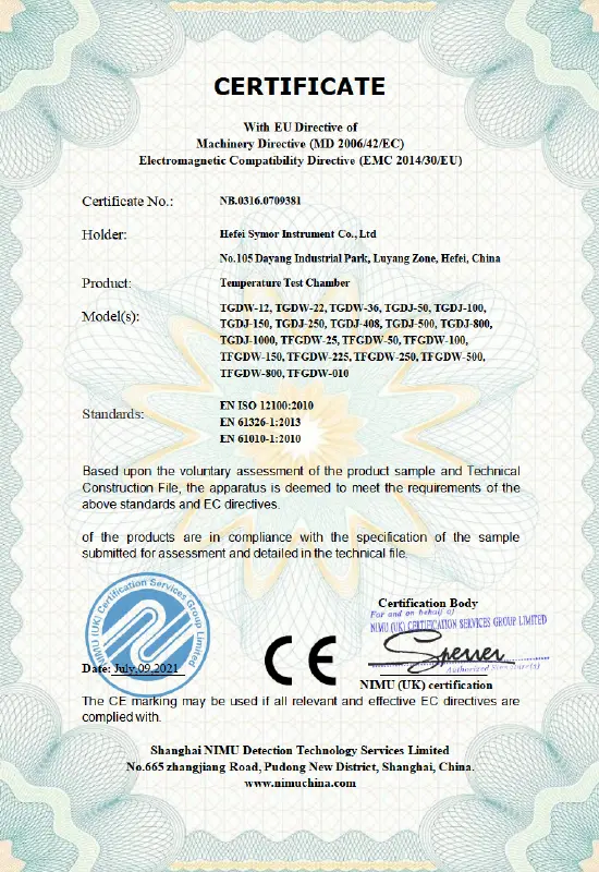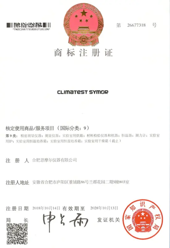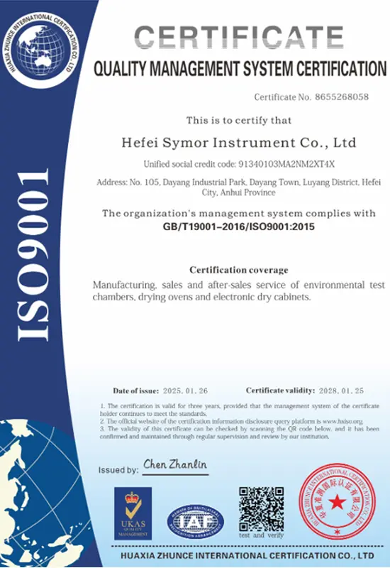 Bedrijfssucces is gekoppeld aan kwaliteit. Gedreven door een streng kwaliteitscontrolesysteem streven we ernaar superieure producten en oplossingen te leveren en streven we ernaar toegevoegde waarde te creëren voor onze wereldwijde klantenkring. Symor Instrument Equipment Co., Ltd is ISO 9001:2015 gecertificeerd, alle klimaatkamers en droogkasten zijn CE goedgekeurd.